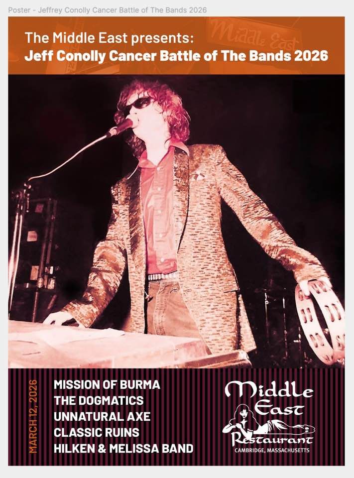 This very evening—Thursday, March 12, 2026—a major benefit concert titled the Jeffrey Conolly Cancer Battle of The Bands 2026 takes place at the iconic Middle East Downstairs in Cambridge (Boston area). Doors open at 7:00 PM, it's an 18+ show with tickets around $30. Headlined by Mission of Burma, the lineup includes other Boston scene stalwarts like Classic Ruins, Unnatural Axe, Nat Freedberg (Joint), The Dogmatics, Hilken & Melissa Band, and special guests.